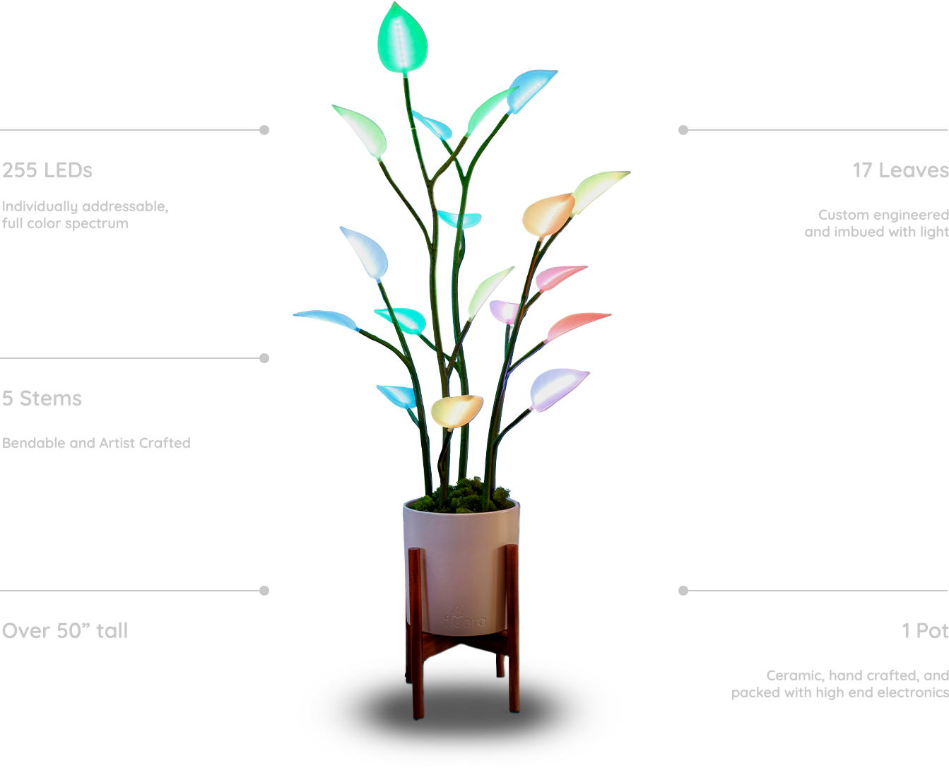 If Fluora is a canvas, the app is your paintbrush. Use it to explore our library of custom animations, and fine-tune your favorites. Sync Multiple Fluoras together with ease. All through the connection on your home WiFi network.